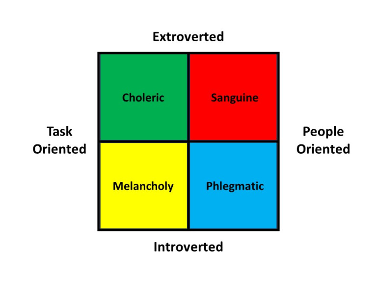 Choleric– Highly competitive, type A personality. Self-motivated and extremely ambitious. Often times, they have a hard time working well in groups because of their intense nature. They tend to be strong leaders though that are great at accomplishing goals. Cholerics are extroverted as well. This personality type is associated with FIRE.